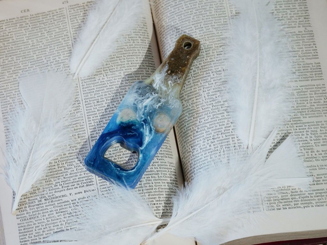 Ce décapsuleur aux inclusions de sable et de coquillages vous transporte dans vos vacances.